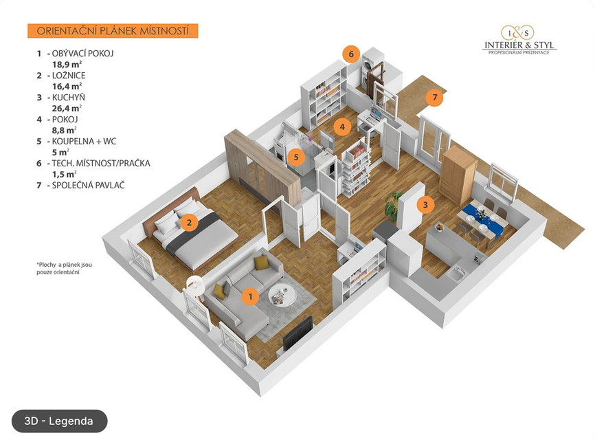 Byt se nachází ve druhém nadzemním podlaží, v dostatečné výšce nad okolní zástavbou, s příjemným výhledem a zároveň naprostým soukromím. Dispozici lze navíc snadno upravit podle vlastních preferencí – ať už jako komfortní 3+1, nebo moderní 4+kk.